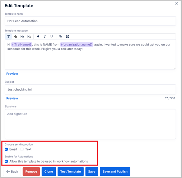 3. Once your message text is ready, select Email, Text, or both, and check the box to Allow Template for Automations.